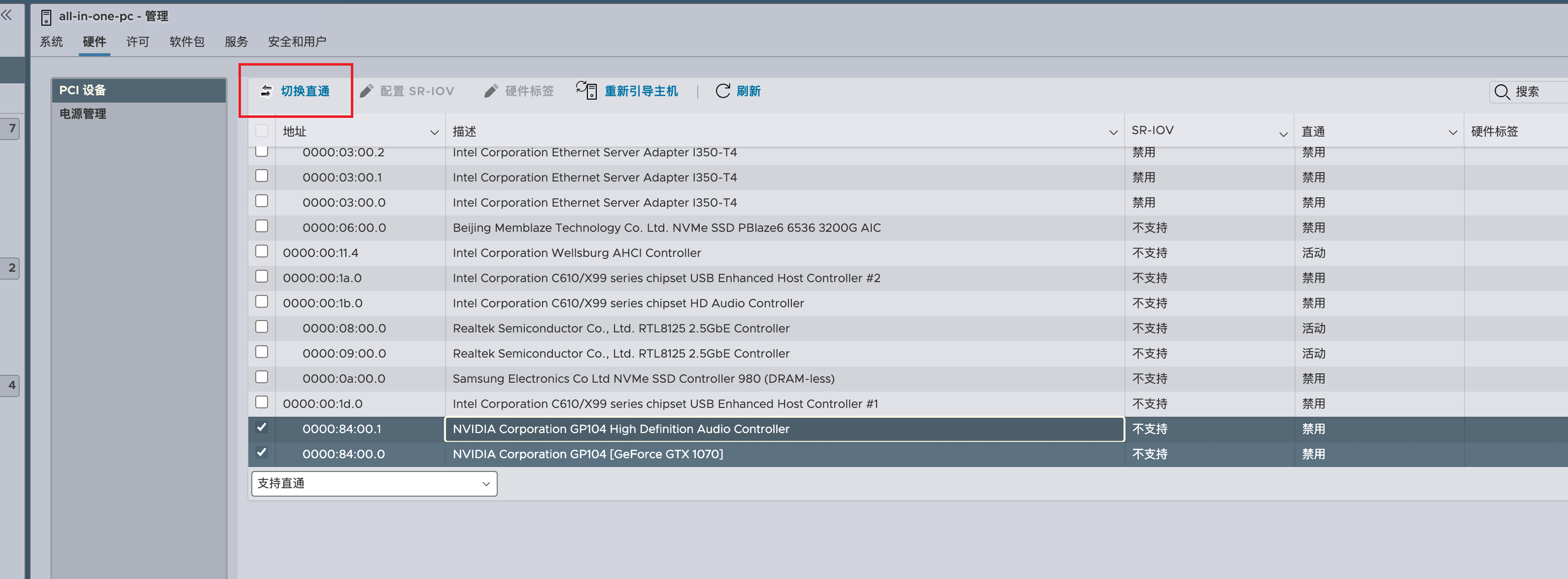 如果直通管理网卡,可能导致无法远程管理 ESXi,所以至少保留一个网卡用于 ESXi 管理。