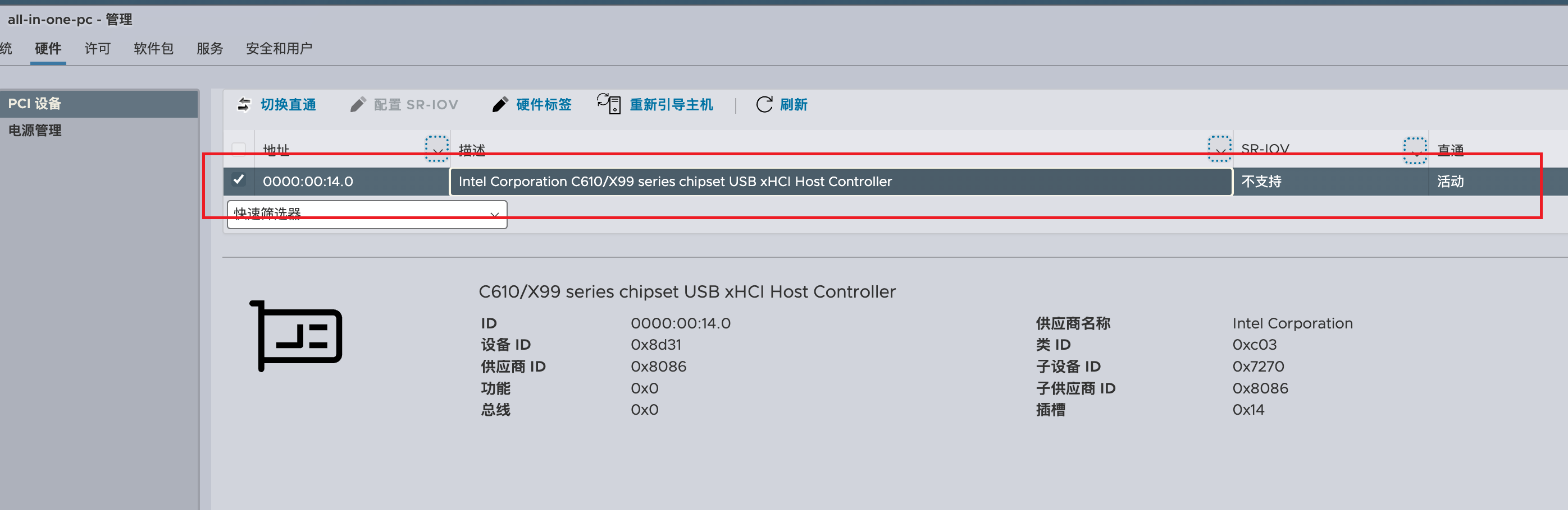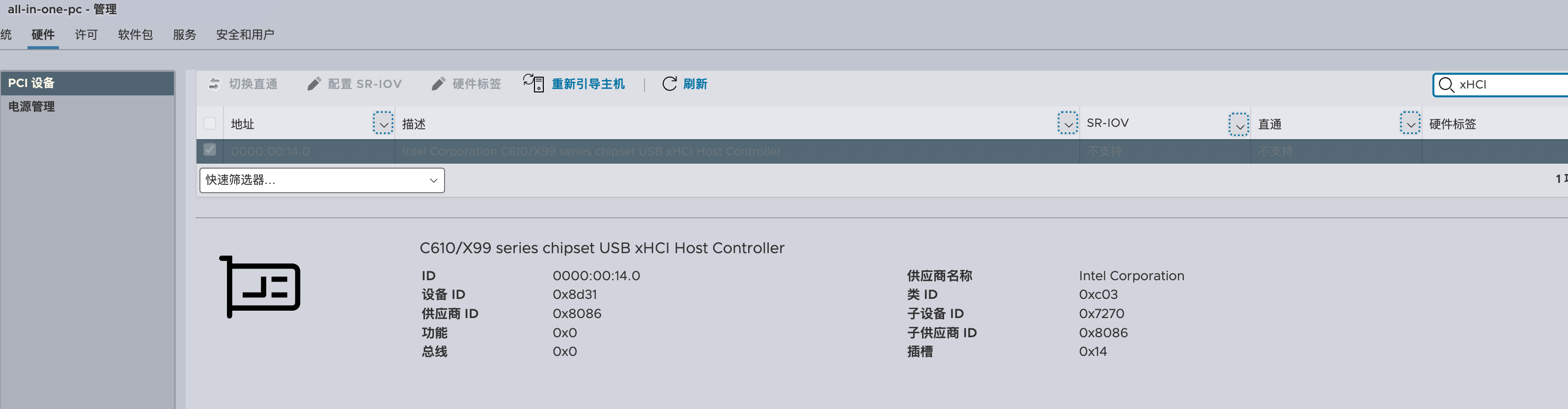 主板通常有一个 xHCI 控制器。ESXi 默认禁用 USB 控制器直通(显示为灰色)。