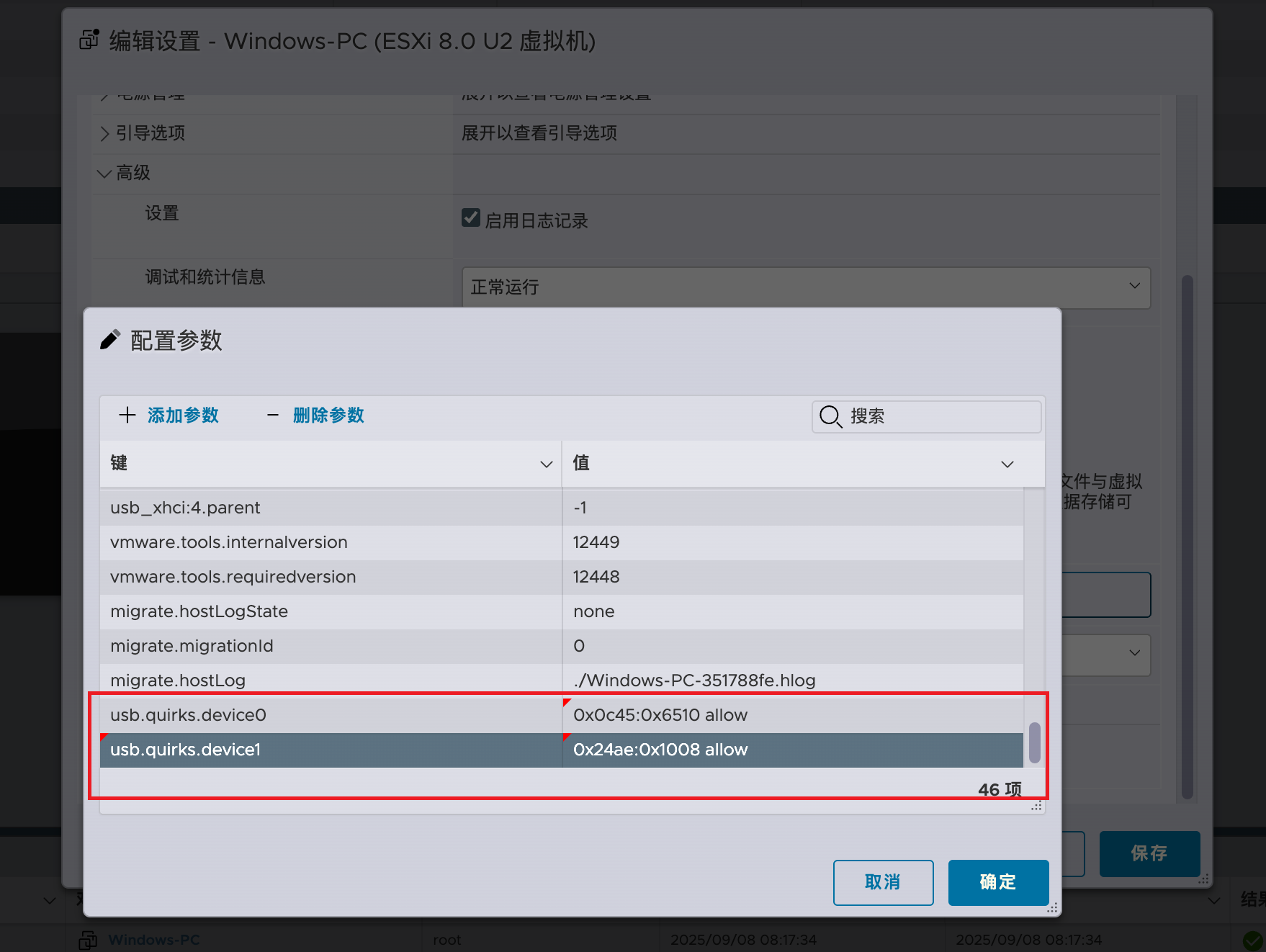 在目标虚拟机中添加设备 ID:【编辑虚拟机】→【虚拟机选项】→【高级】→【编辑配置】→【添加参数】: