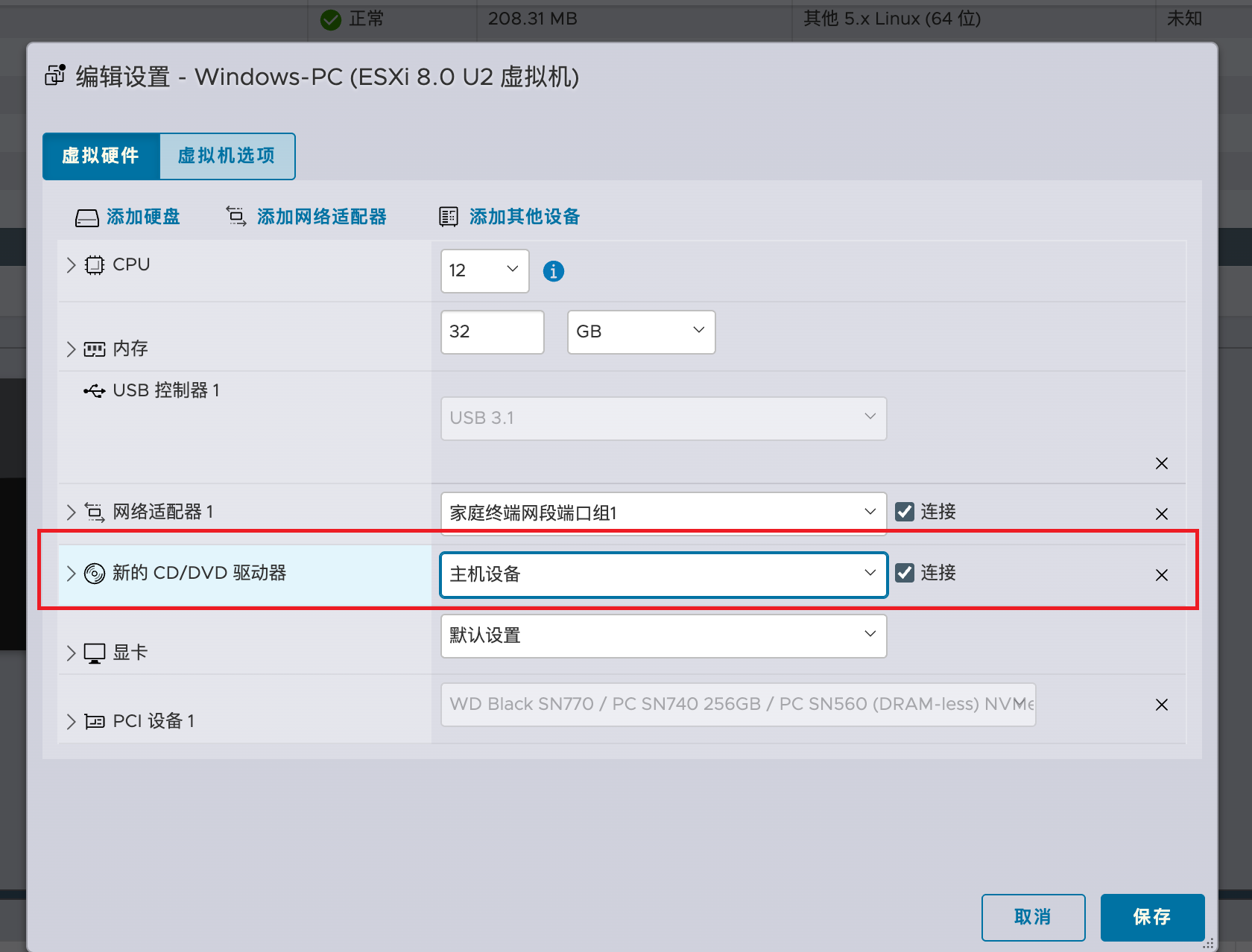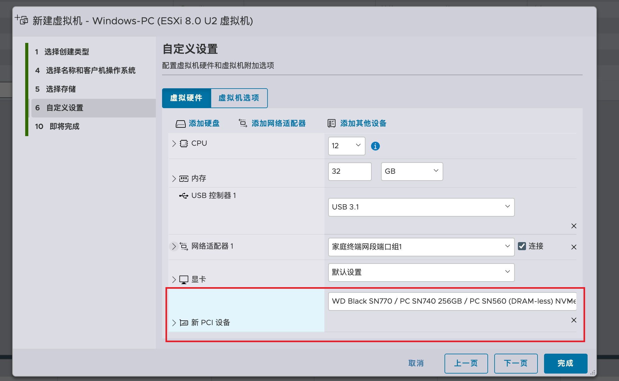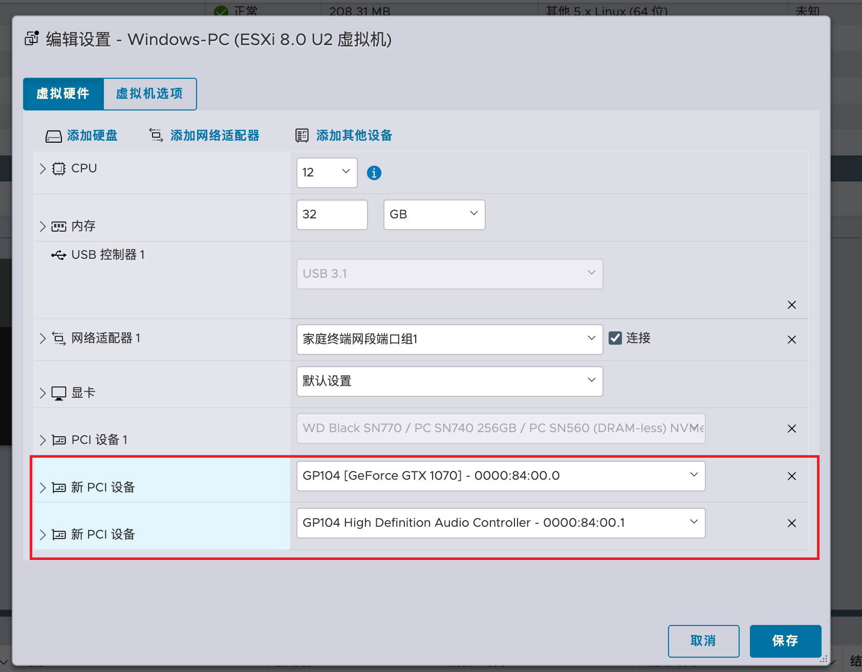 显卡切换直通后,需要将其分配给指定虚拟机:【编辑】→【添加其他设备】→【PCI 设备】,选择已直通的显卡设备(包括视频和音频控制器),保存配置并启动虚拟机。