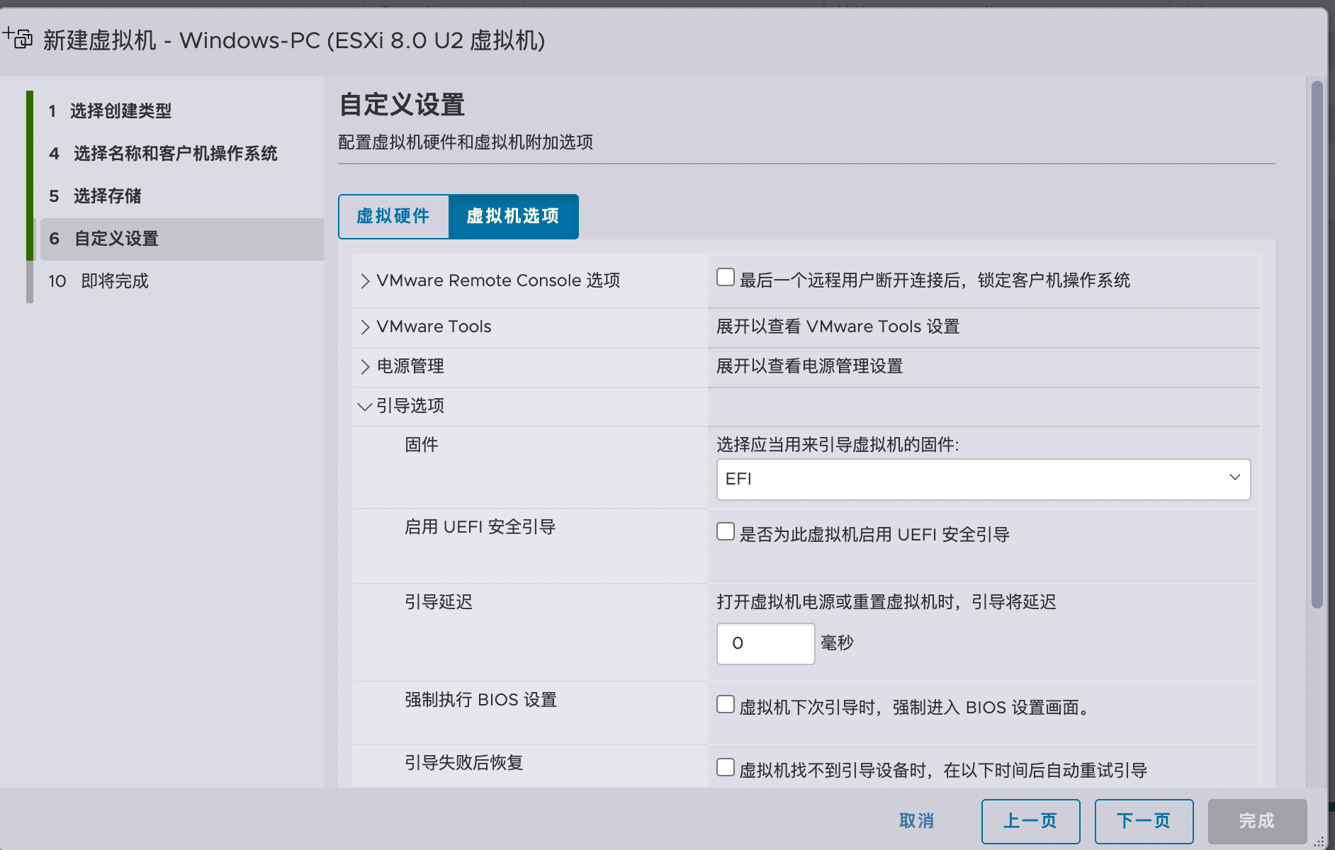 设置启动模式:在虚拟机选项中,将固件设置为 EFI(支持 UEFI 启动)
