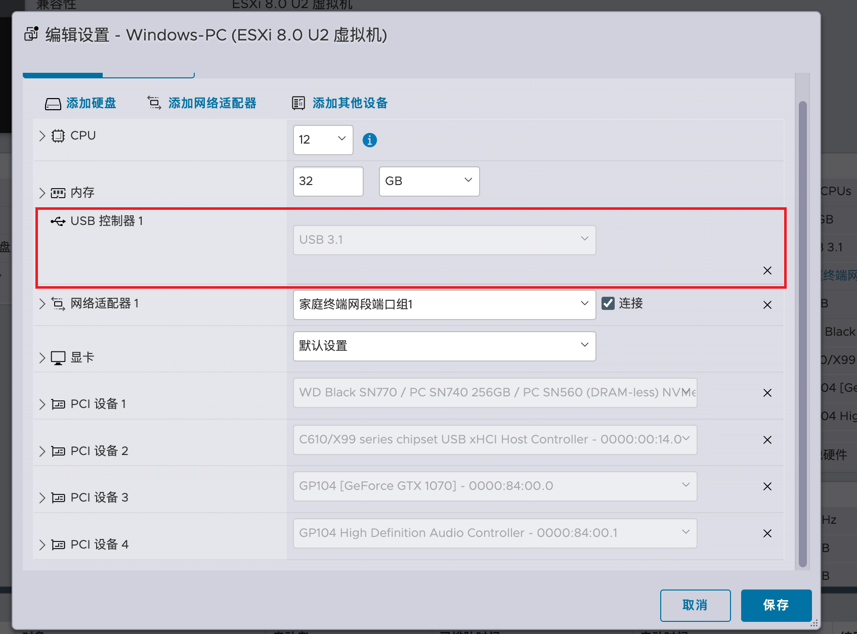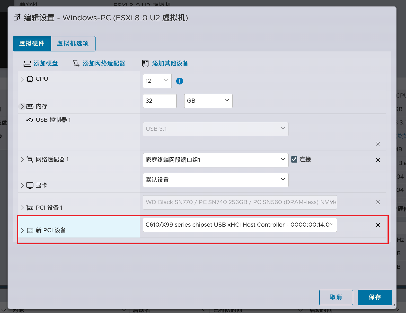 详细步骤请参见 硬件直通 - 直通 USB 控制器 章节。注意:直通完成后还需将设备添加到虚拟机硬件中。