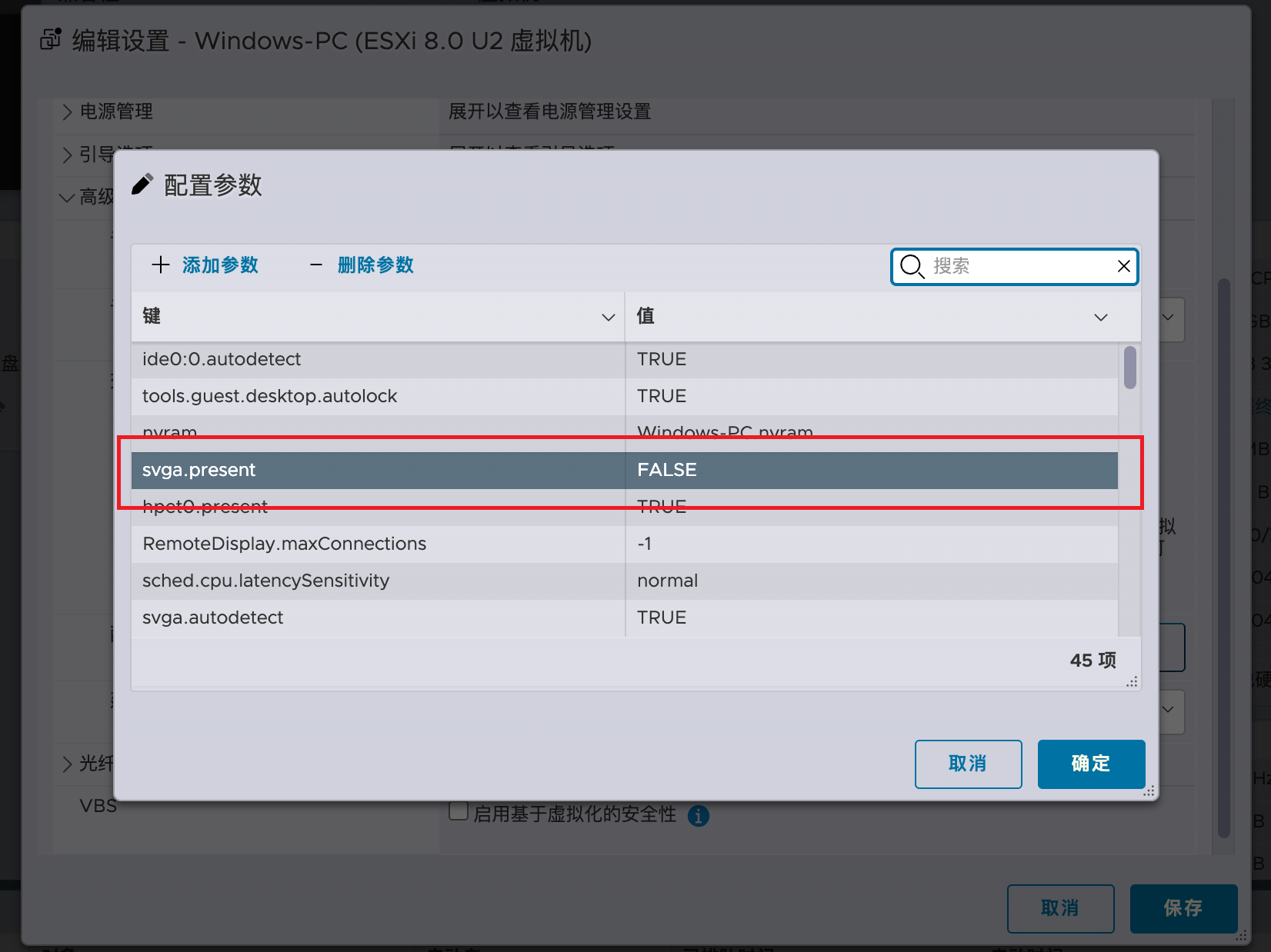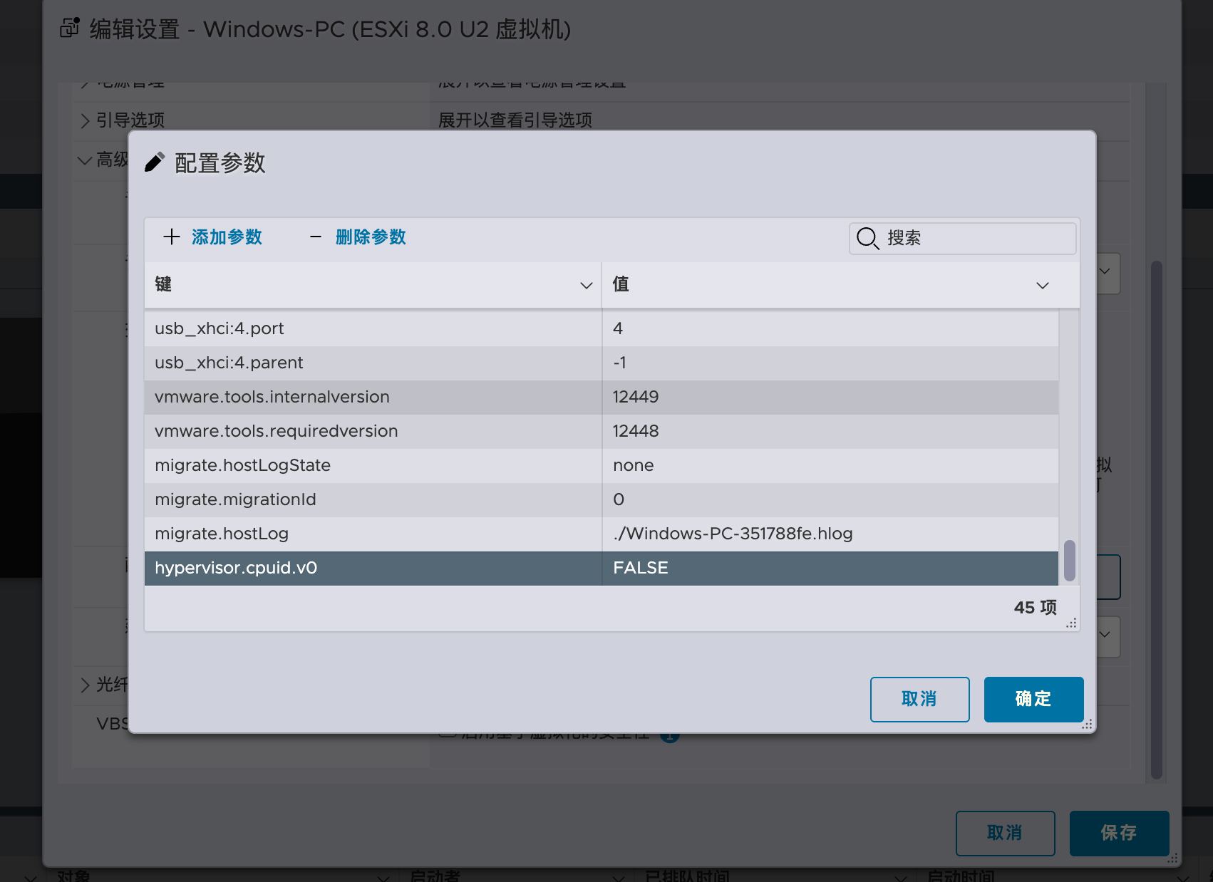 点击【关闭电源】后,【编辑虚拟机】→【虚拟机选项】→【高级】→【编辑配置】→【添加参数】: