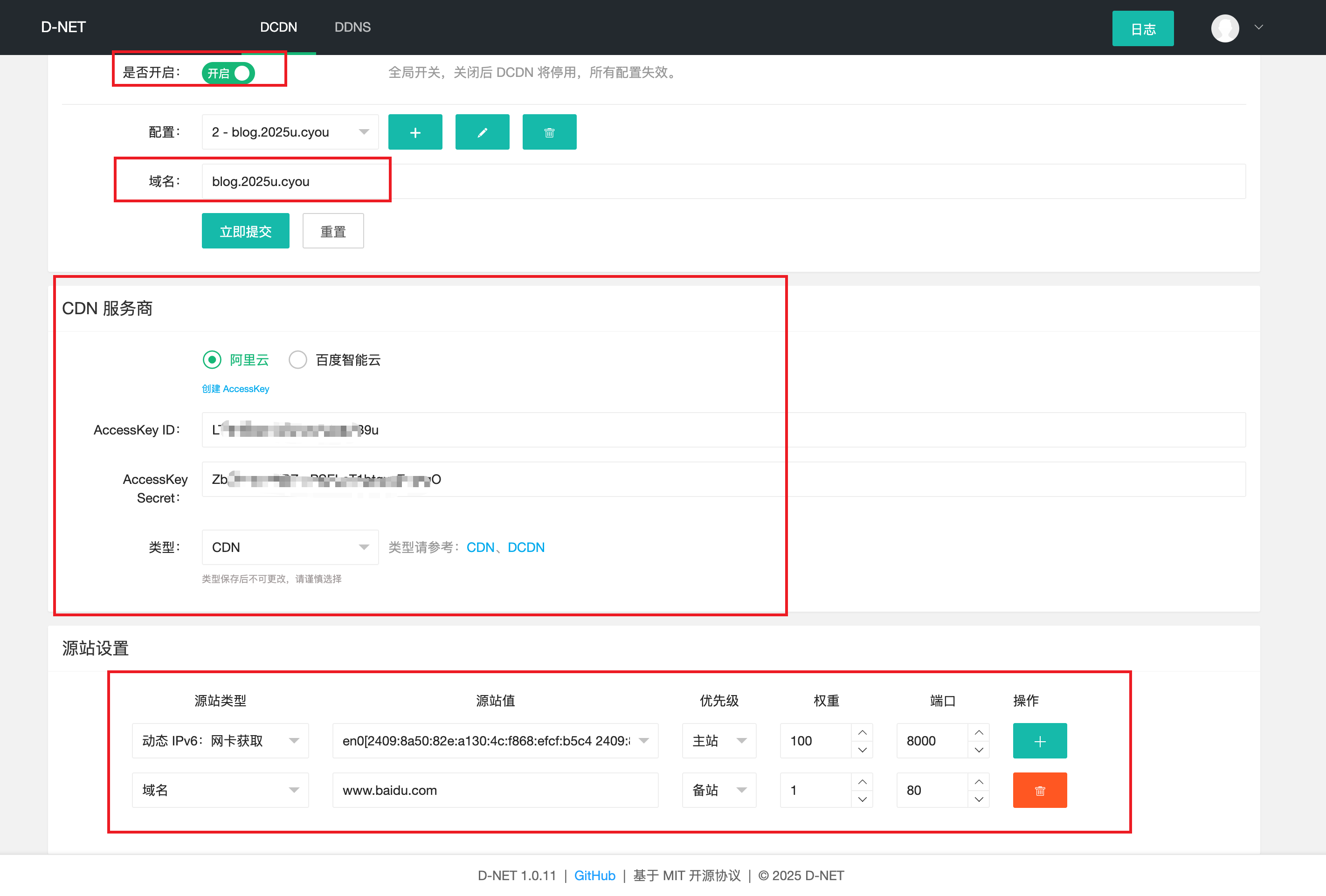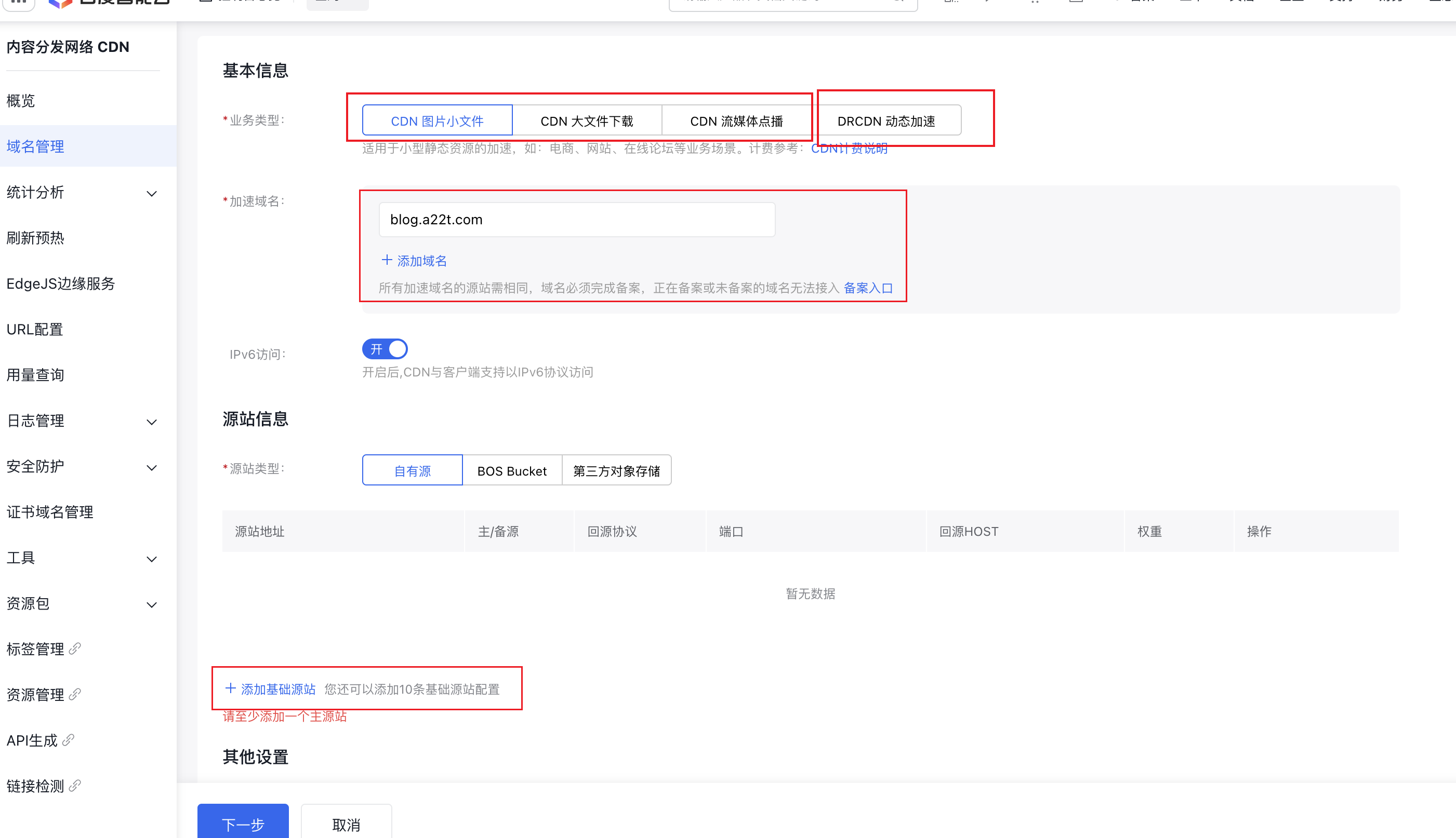 由于阿里云 CDN 不允许使用单独的 IPv6 源站,这里的源站地址需要填写步骤 3 中配置的备用域名源站(如 www.baidu.com)。