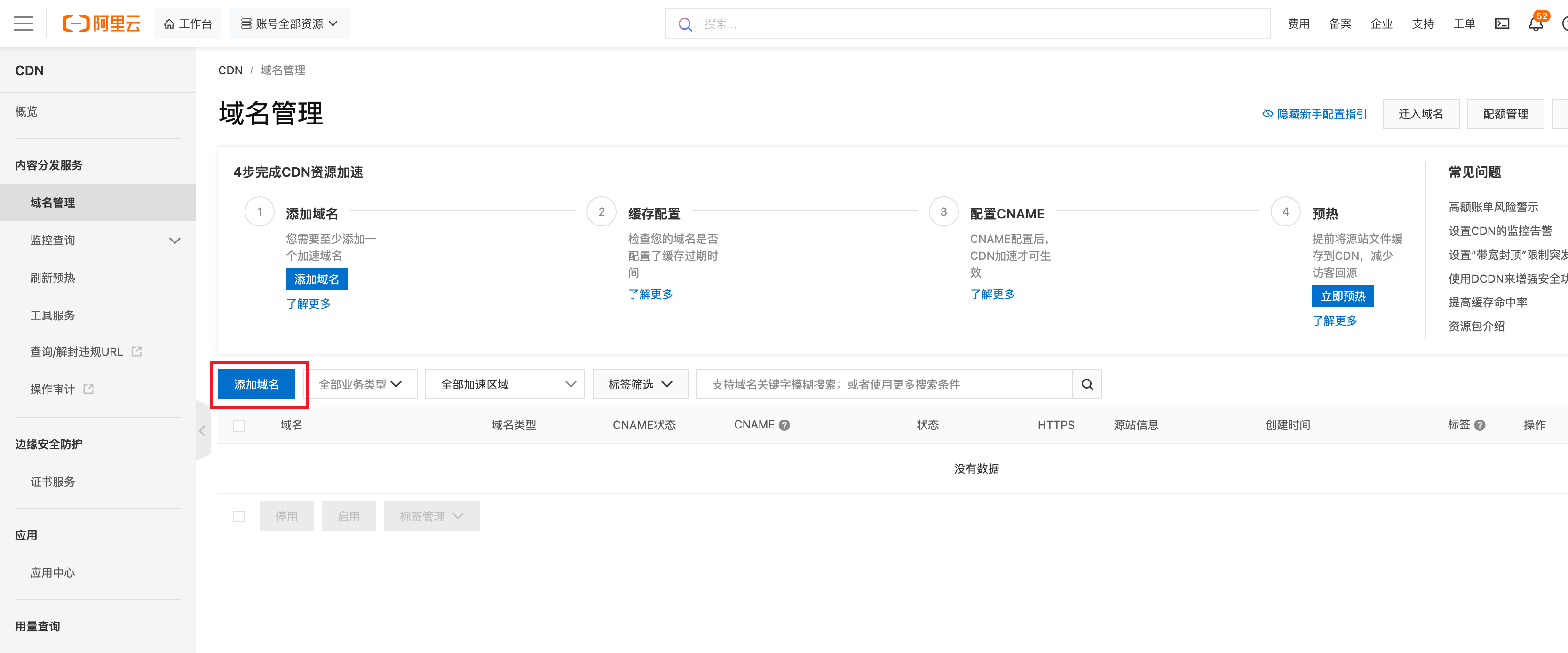 如果域名未备案,只能使用 阿里云 CDN 全球区域进行加速。这种方案的缺点是:访问速度可能较慢,费用相对较高。
