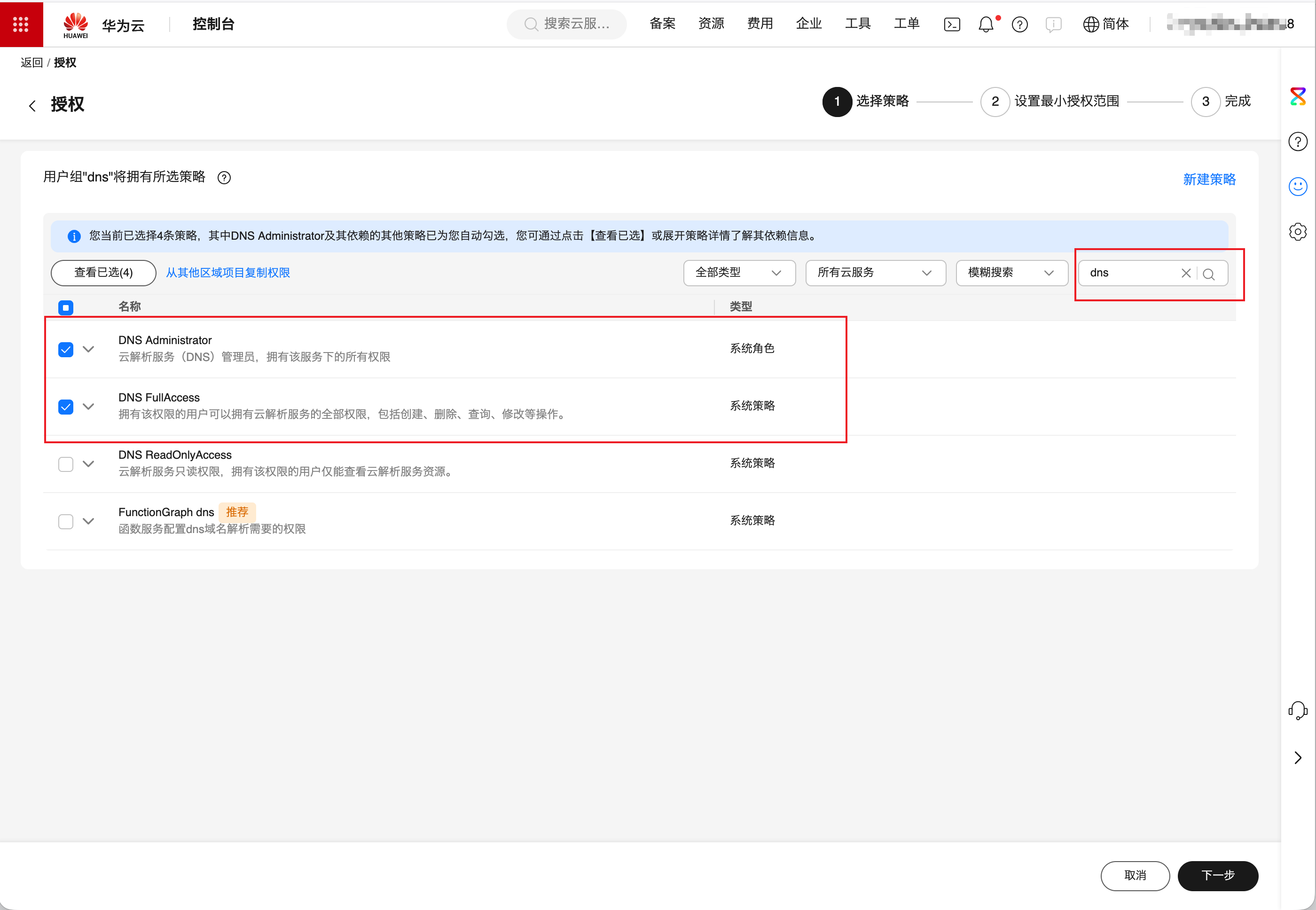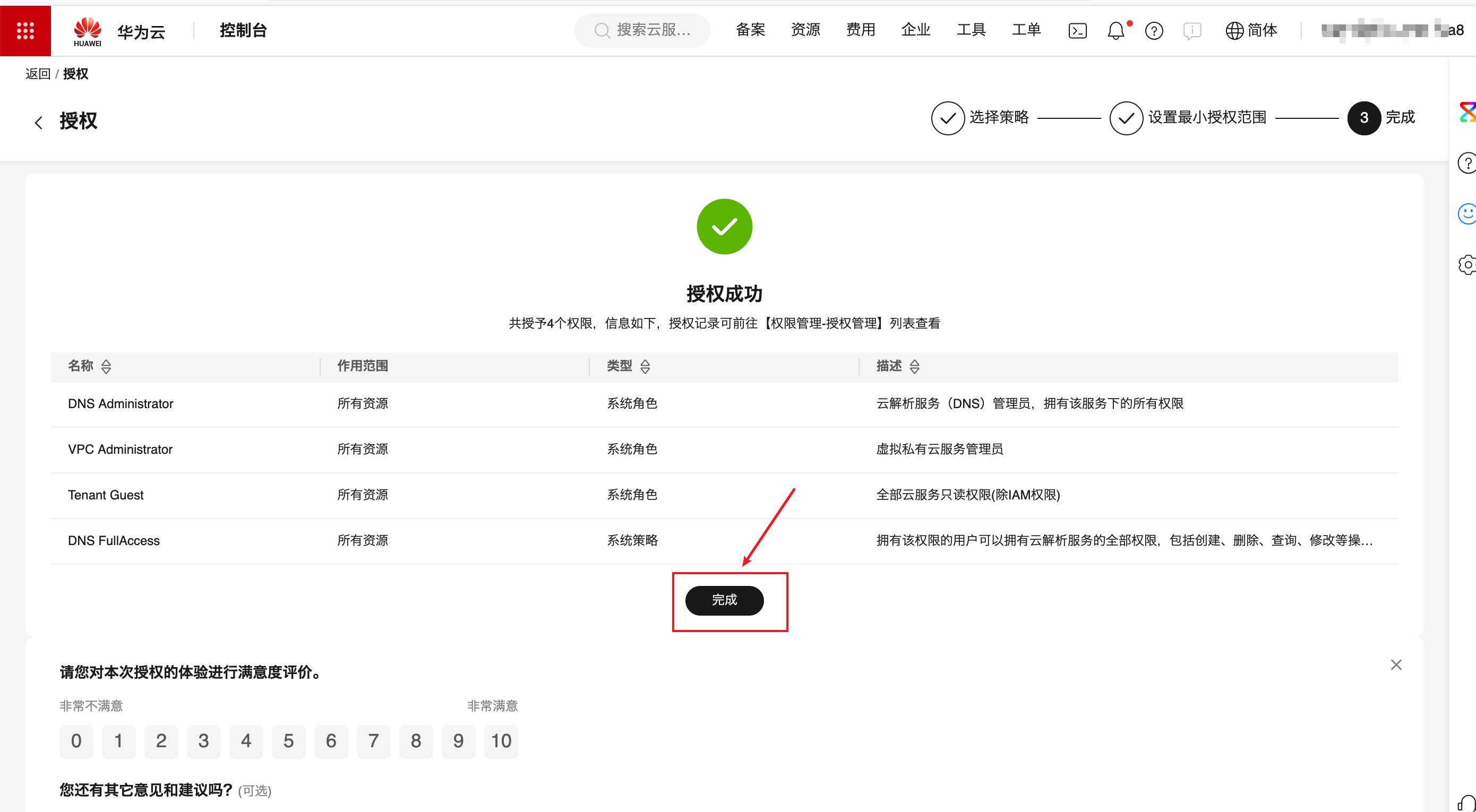 如果使用华为云 DNS,必须创建 IAM 子账号并授权相应权限,详见 华为云特殊设置