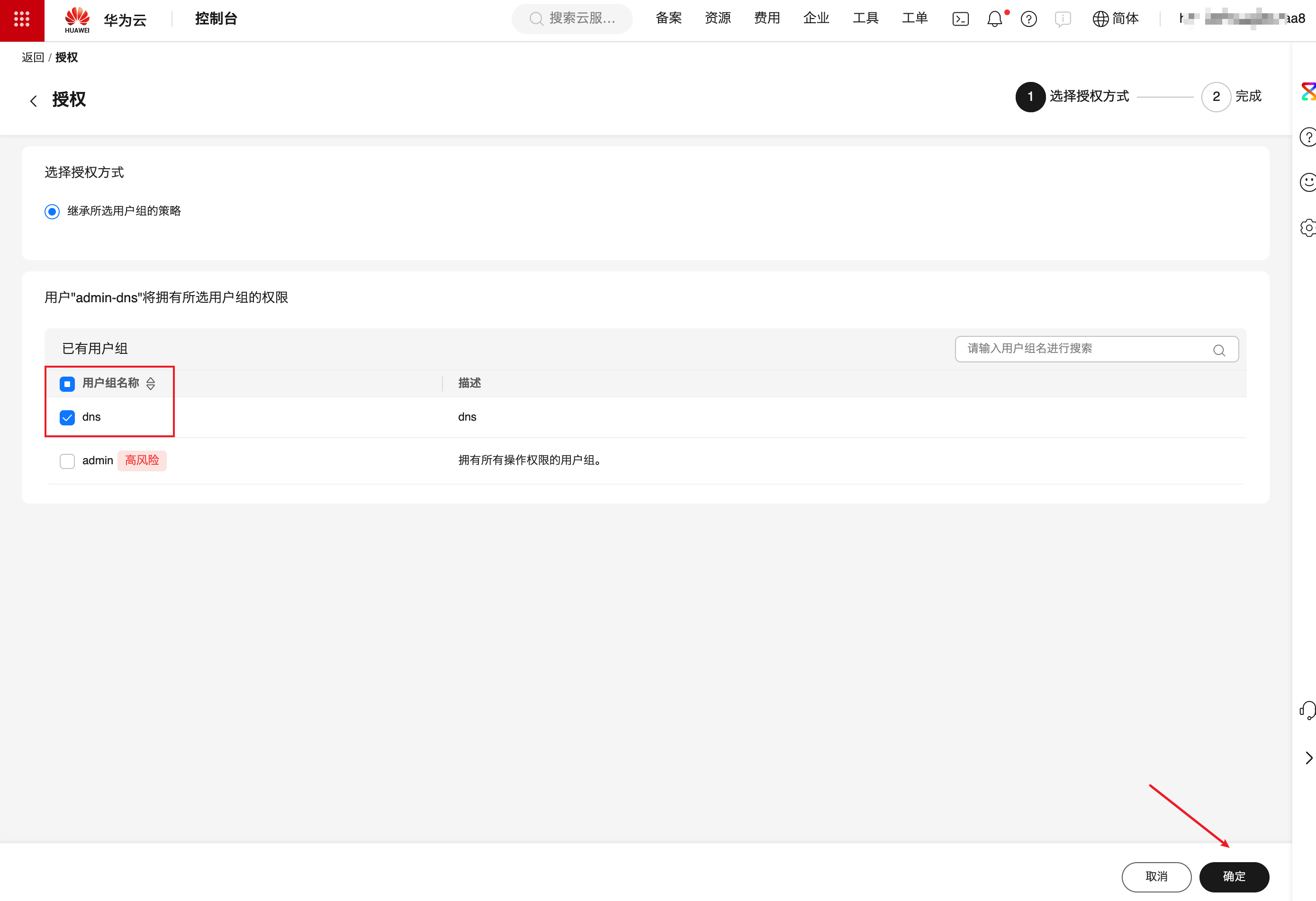 完成子用户创建后,需要创建用户组并授予 DNS 管理权限。