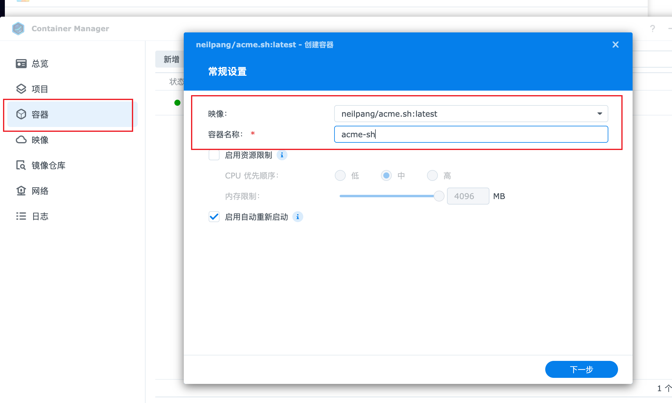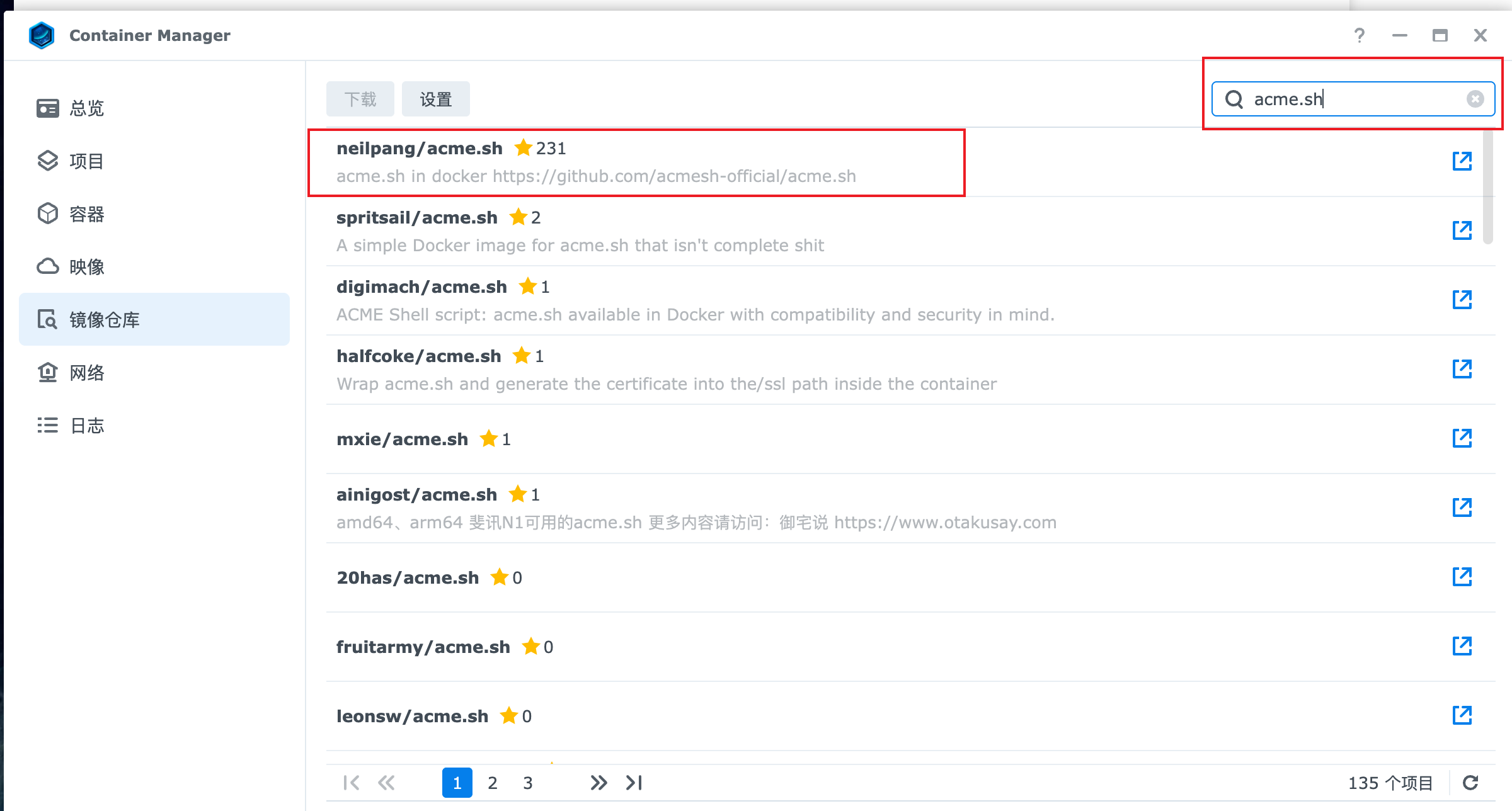 安装完 Container Manager(Docker)后,需要下载并运行 acme.sh 容器镜像。