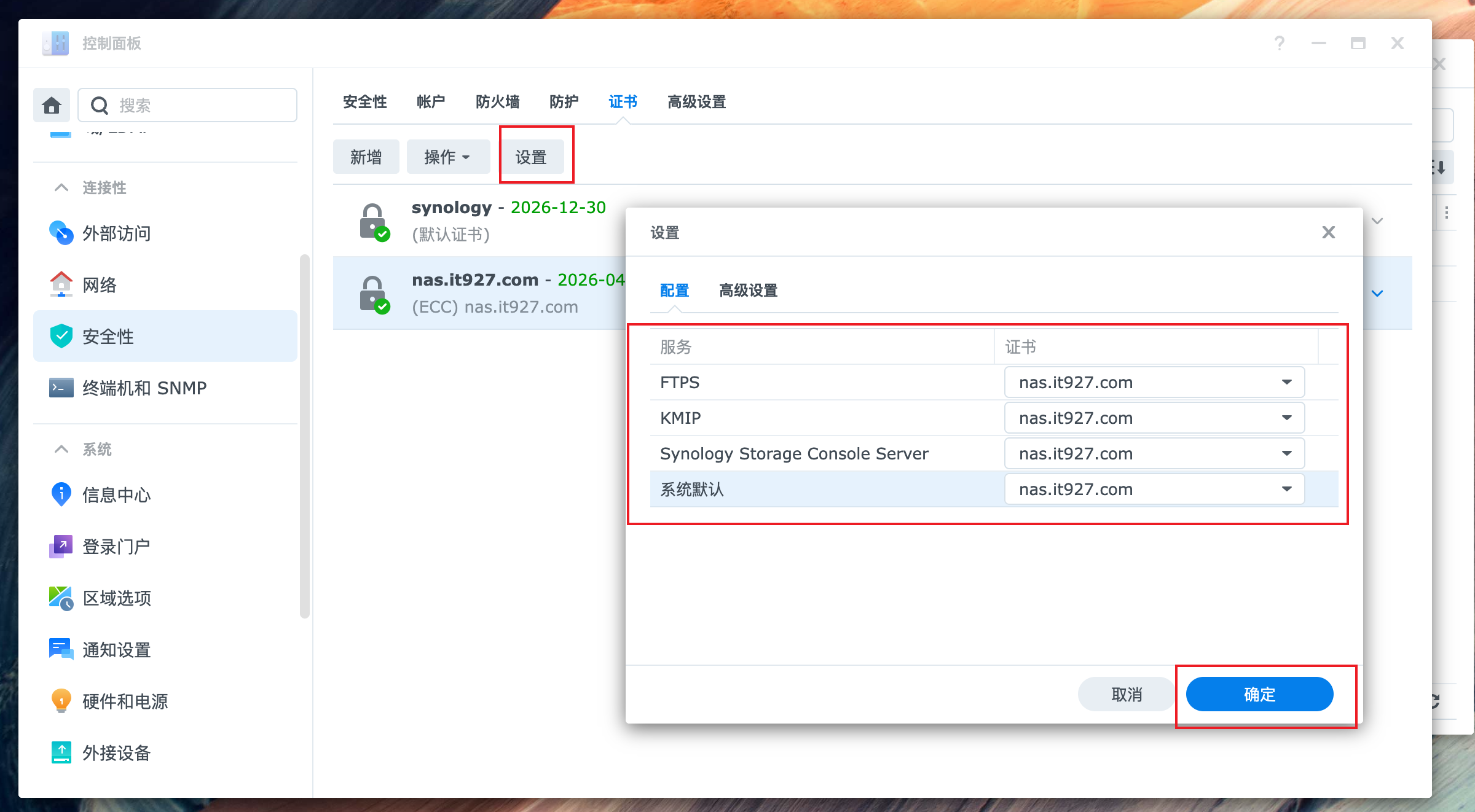 证书部署成功后,需要在 DSM 中将其设置为默认证书。