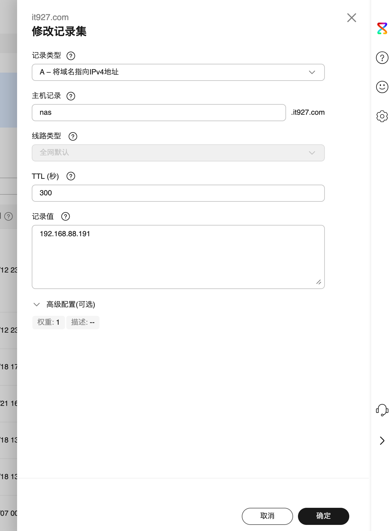首先需要在域名服务商处添加 DNS 解析记录,将域名指向群晖的 IP 地址。